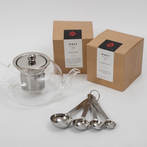 Un té Earl Grey 50g, un té personalizable 50g, una tetera Crisa, + un set de cucharas medidoras.