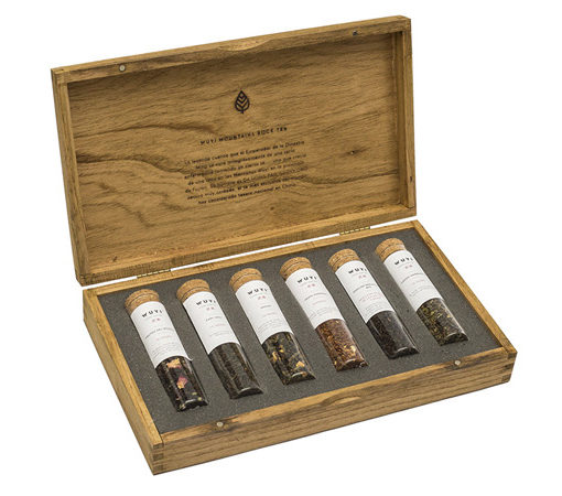 Caja de madera de paraíso con selección de 6 tés (120g) en tubo de vidrio.